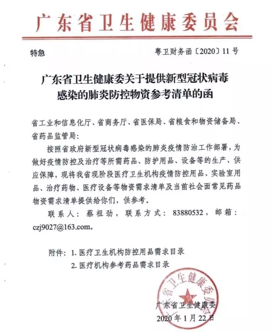 ▲廣東省衛(wèi)生健康委員會《關于提供新型冠狀病毒感染的肺炎防控物資參考清單函》