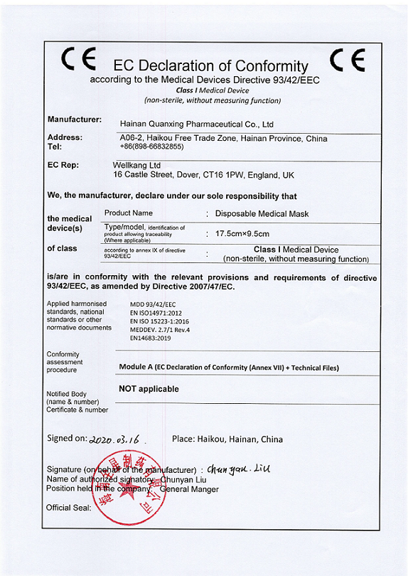 至此我司非無菌醫用口罩順利通過CE認證,成為海南省首家醫用口罩產品通過歐盟認證的企業。