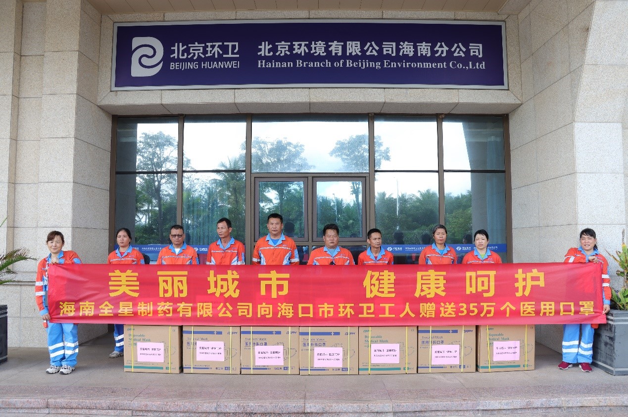 海南全星制藥有限公司向??谑协h衛工人贈送35萬個醫用口罩